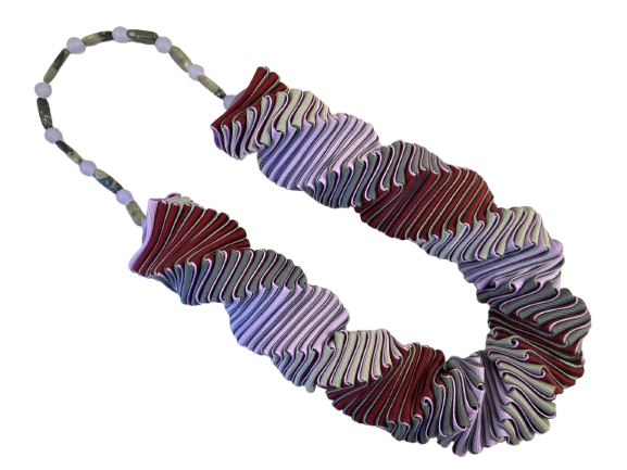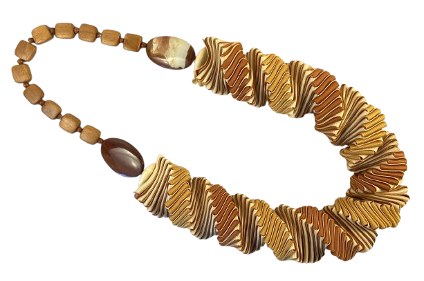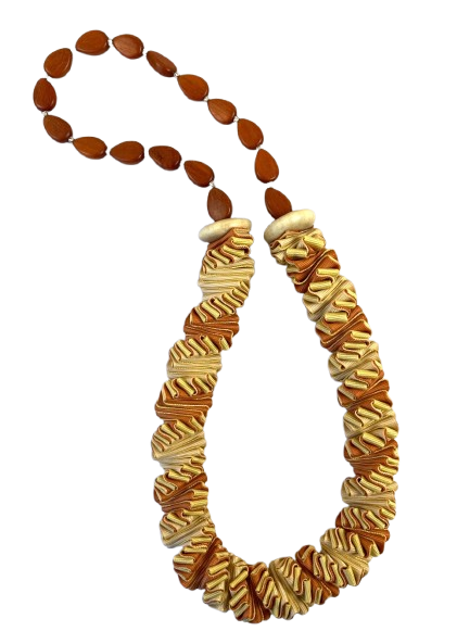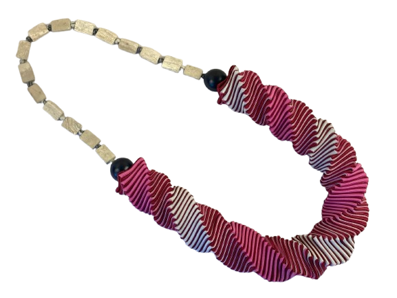 Dramatic statement necklaces that express your unique style – hand crafted from richly colored grosgrain ribbon with accents of sustainably harvested tropical hardwoods, gemstones and recycled glass.