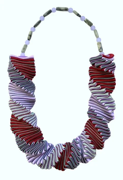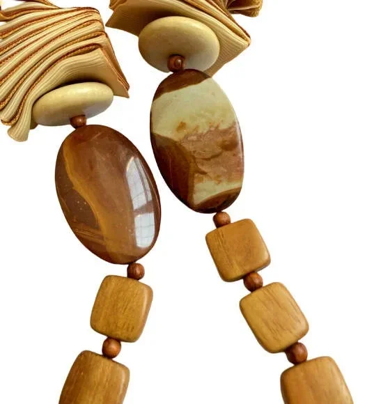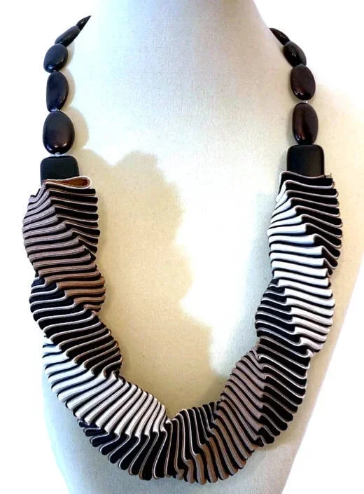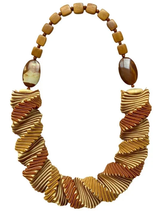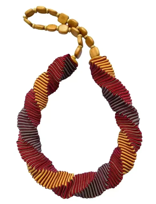 Each necklace is hand crafted from high quality, richly colored grosgrain ribbon, with accents of sustainably harvested tropical hardwoods, semi-precious stones, or recycled glass.