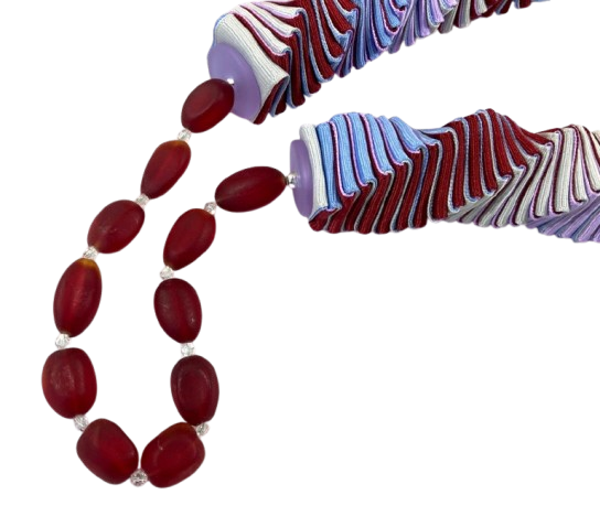 Shades of cranberry, pale blue, light orchid and pale silver, accented with deep red recycled glass beads and crystal spacers.Standard width, 32” long, 7 oz.
