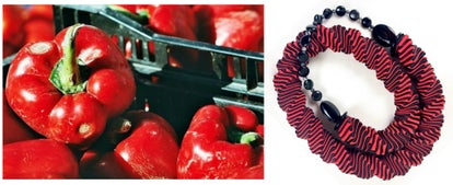 Black and red, accented with onyx and map jasper. Inspired by a black crate of bright red peppers I saw at a NYC green market.